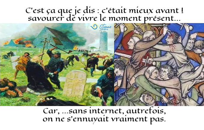 Chères Petites Poucettes, chers Petits Poucets, ne le dites pas trop à vos vieux dont je suis, c’est tellement mieux aujourd’hui : “Grands Papas Ronchons” qui répètent que tout était mieux avant la paix, la longévité, les antalgiques, la Sécu, l’alimentation surveillée, l’hygiène et les soins palliatifs, ni service militaire ni peine de mort, les voyages, le travail allégé, les communications partagées… […] Avant, nous gouvernaient Franco, Hitler, Mussolini, Staline, Mao… rien que des braves gens ; avant, guerres et crimes d’État laissèrent derrière eux des dizaines de millions de morts. »