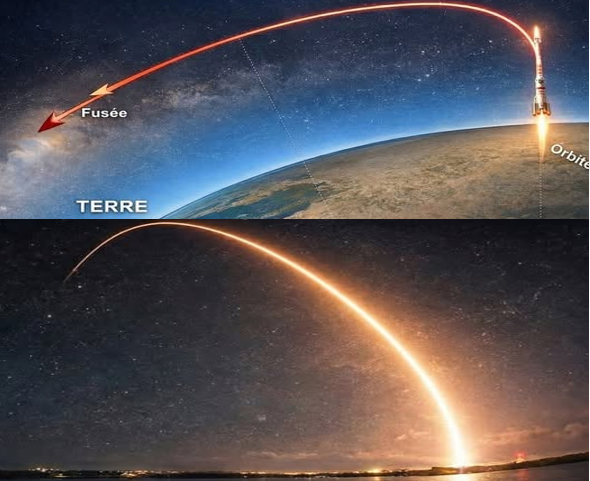 Suite de ce post : https://etiennechome.site/se-mettre-en-orbite-tomber-assez-vite/. L’objectif d’un lancement spatial n’est pas d’envoyer la fusée tout droit vers le haut, il est d’accomplir un « virage gravitationnel » : la traînée lumineuse dessine un arc parfait et non une ligne droite vers le haut. La vitesse doit être ni trop lente (retomber sur Terre) ni trop rapide (quitter la Terre) ; elle est calculée pour que le satellite devienne prisonnier du bon champ gravitationnel !