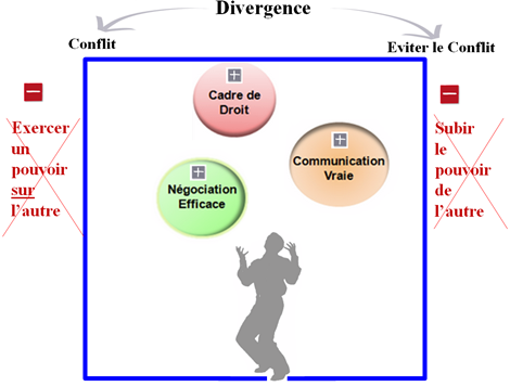 Aux côtés de la communication vraie et du cadre de droit, une troisième compétence est indispensable à la résolution constructive d’un conflit : l’art d’une négociation efficace qui évite les pièges des réflexes de rivalité et de compétition en cas d’intérêts divergents et qui est capable de déjouer les techniques de déstabilisation, les tactiques déloyales, les effets de manche, les coups de botte secrète, etc. Plus une personne a appris à rester focus sur les intérêts en présence et à employer la créativité qui invente des solutions nouvelles, plus elle peut induire et garder le cap d’un processus Win-Win : optimiser l’accord le plus pertinent et judicieux, c’est-à-dire celui qui satisfait au mieux tous les intérêts en présence.